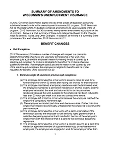 In 2013, Governor Scott Walker signed into law three pieces of legislation containing substantial amendments to the unemployment insurance (UI) program. 2013 Wisconsin Act 20 (the state’s 2013-15 budget) contained amendments to seven aspects of the UI program. 2013 Wisconsin Act 36 contained twenty-seven amendments to portions of the UI program. Below is a brief summary of these Acts categorized based on the changes made to Benefits, Taxes, and Other Changes. In addition, at the end is a summary of the provisions of the work share law, 2013 Wisconsin Act 11.